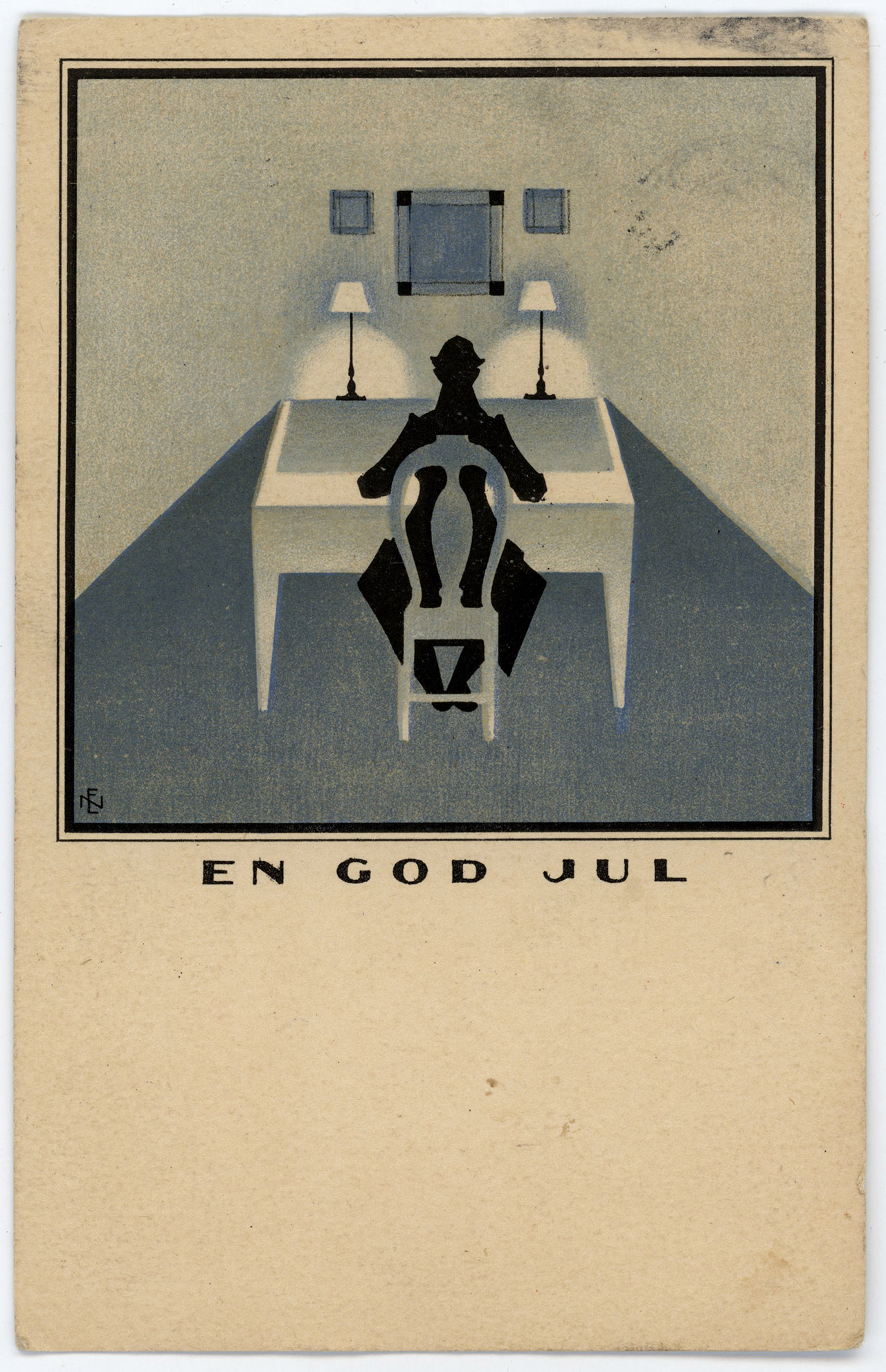 Detta julkort, som även finns med en nyårshälsning, är tecknat av konstnären Einar Nerman (1888-1983). Nerman är internationellt känd för sina karikatyrer. Han fick av stiftelsen Solstickan uppdraget att rita en etikett till tändsticksaskar och skapade då Solstickepojken som blev en av Sveriges mest välkända symboler.